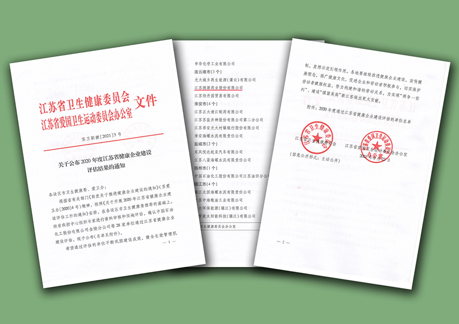 近日,江蘇省衛(wèi)生健康委員會、江蘇省愛國衛(wèi)生運(yùn)動委員會辦公室發(fā)文,公布了2020年度江蘇省健康企業(yè)建設(shè)評估結(jié)果,我公司位列通過企業(yè)名單之中。