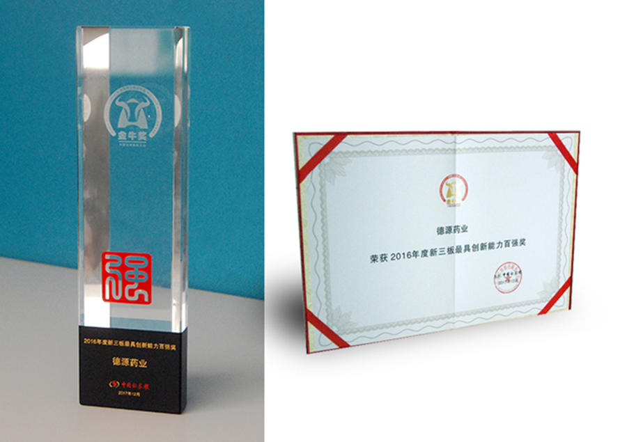 由中國證券報組織評選的“2016年度新三板金牛獎”新鮮出爐,200家新三板掛牌公司獲評2016年度新三板金牛獎。本次獎項共設置“新三板最具價值投資百強獎”和“新三板最具創(chuàng)新能力百強獎”,每個獎項各評出100家公司。德源藥業(yè)位列于新三板最具創(chuàng)新力100強企業(yè)榜單。