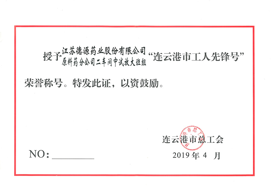 近日,公司原料藥分公司二車間中試放大班組被連云港市總工會(huì)授予“工人先鋒號(hào)”榮譽(yù)稱號(hào)。原料藥分公司二車間中試放大班組主要承擔(dān)公司研究所研發(fā)項(xiàng)目的中試放大生產(chǎn)工作。近年來(lái),公司研發(fā)項(xiàng)目的中試放大生產(chǎn)品種多,時(shí)間緊,任務(wù)重,但是他們不怕苦不怕累,搶時(shí)間,爭(zhēng)速度,保質(zhì)量,為新藥注冊(cè)申報(bào)和后續(xù)生產(chǎn)提供了寶貴的數(shù)據(jù),積累了更多的經(jīng)驗(yàn)。