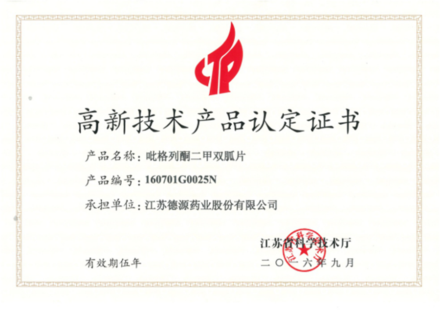 日前,由江蘇德源藥業(yè)股份有限公司首研并首批上市的“復(fù)瑞彤?(鹽酸吡格列酮二甲雙胍片)”成功通過江蘇省高新技術(shù)產(chǎn)品認(rèn)證,獲得高新技術(shù)產(chǎn)品認(rèn)證證書。